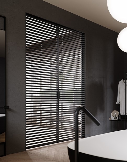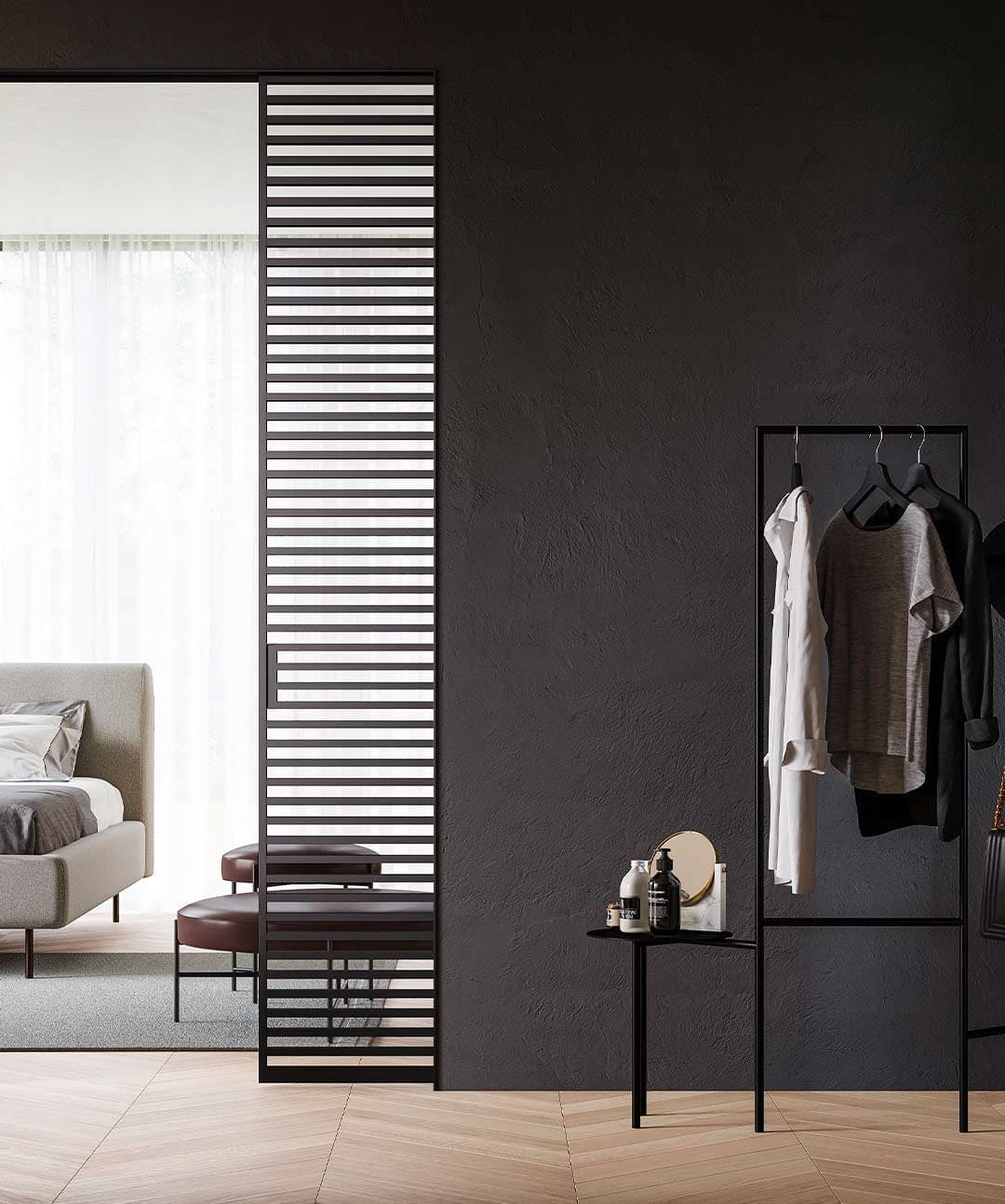 La collezione Line è caratterizzata da un anta con telaio di alluminio (come quello della collezione Mitica) con vetro centrale a cui vengono applicati traversini in alluminio su entrambe le facce del vetro. Personalizzabili per posizione, verso e passo permettono di realizzare diverse configurazioni estetiche in grado di rispondere a differenti esigenze stilistiche e progettuali.