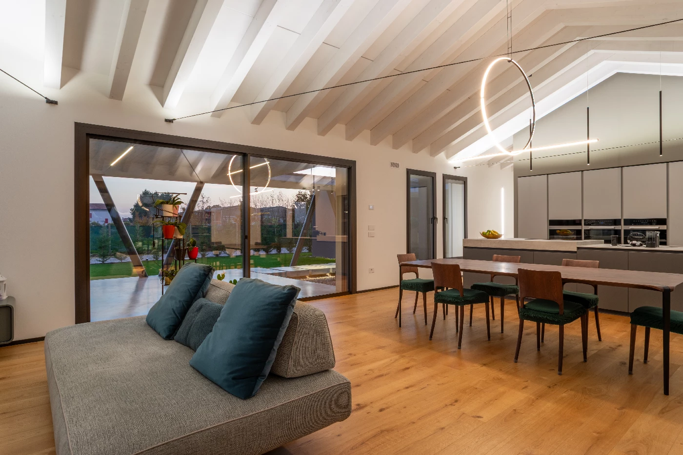 All’interno, la zona giorno si apre in un unico ambiente luminoso, dove cucina, pranzo e soggiorno convivono senza barriere. Le grandi vetrate affacciate sul giardino trasformano la campagna in una presenza costante, rendendo la luce e il paesaggio parte integrante degli interni. Le travi a vista e l’atmosfera calda dei materiali contribuiscono a creare un ambiente familiare, in cui la semplicità diventa eleganza.