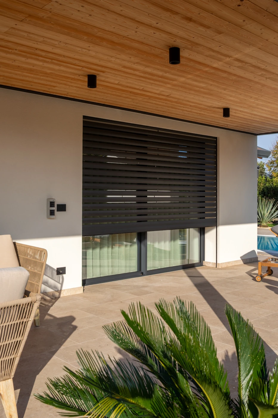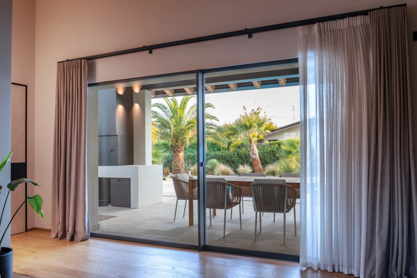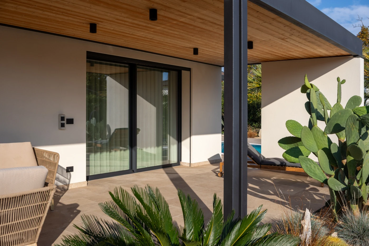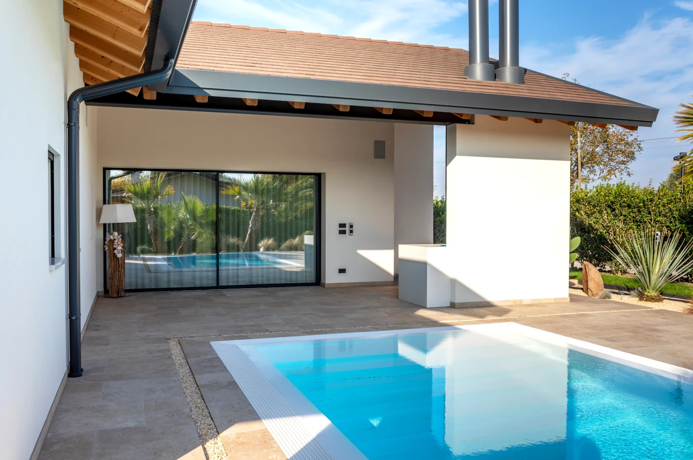 La proposta progettuale si inserisce nel contesto come residenza a “L”, a corte aperta, in cui il patio e il portico sono il fulcro attorno ai quali si distribuiscono i vari vani che beneficiano dell’affaccio sul verde del giardino e sulla piscina, grazie alle ampie vetrate continue.